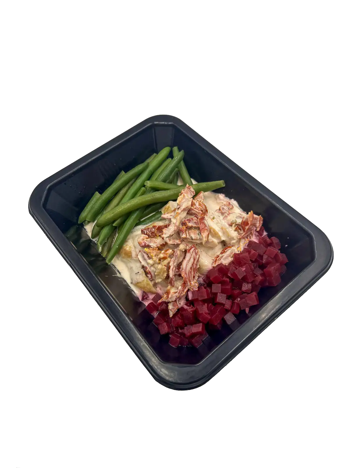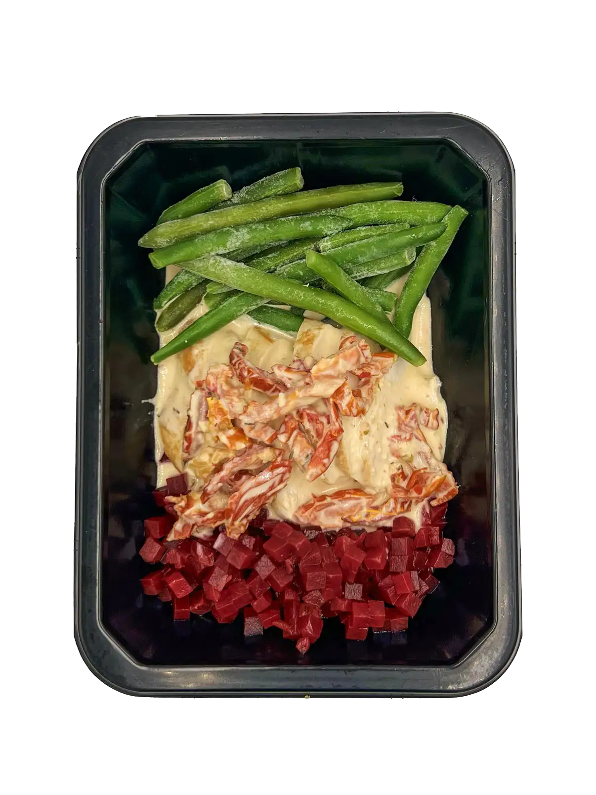 Keto and delicious!! Chicken breast, topped with the creamiest sun-dried tomato sauce ever! Paired with sides of beets and green beans.