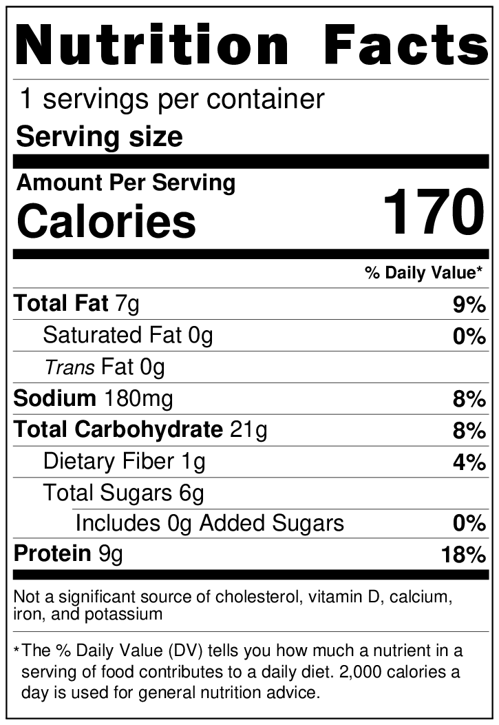 170 Calories -Protein 9g -Carb 21g -Fat 7g (per ball)