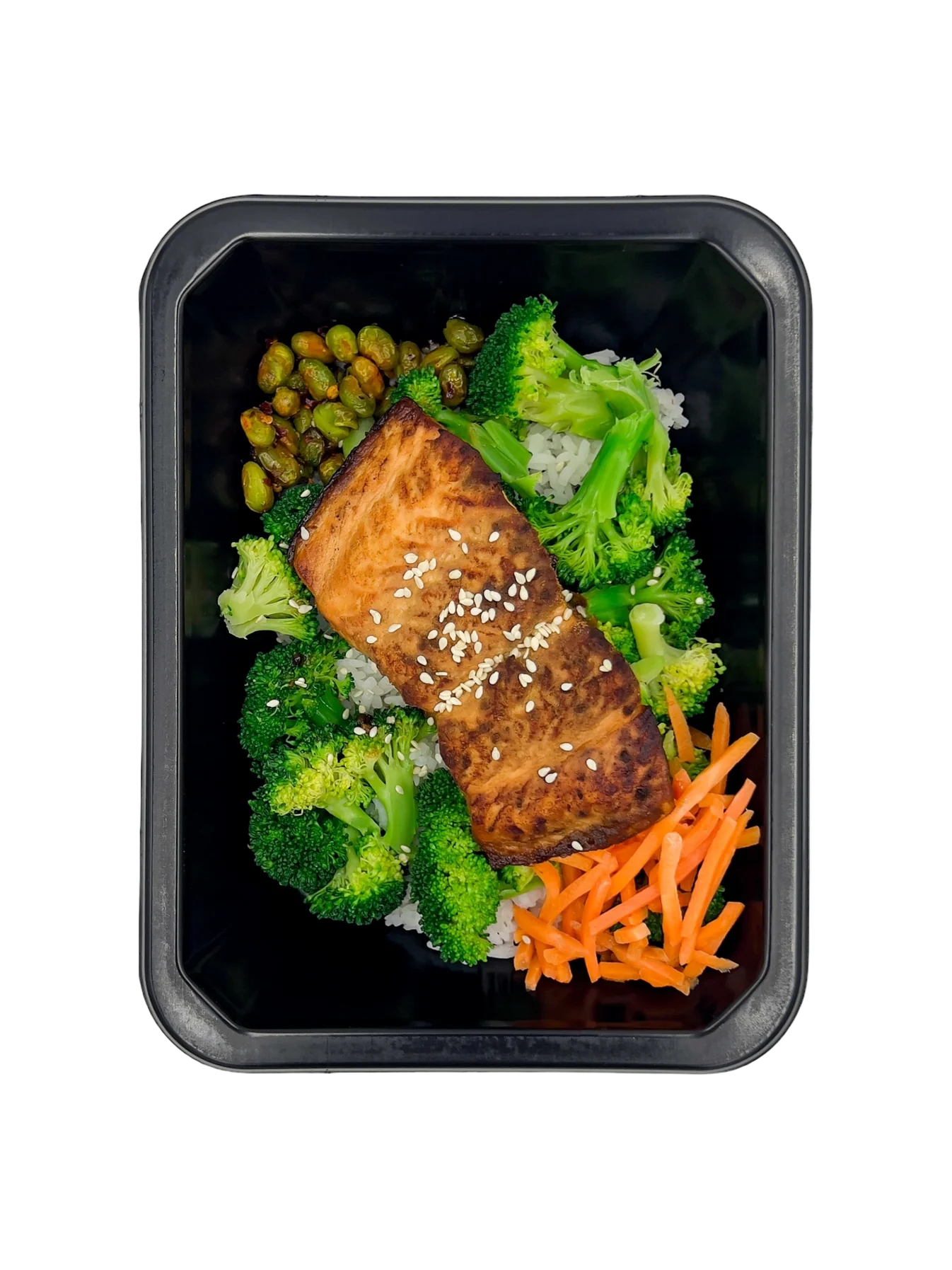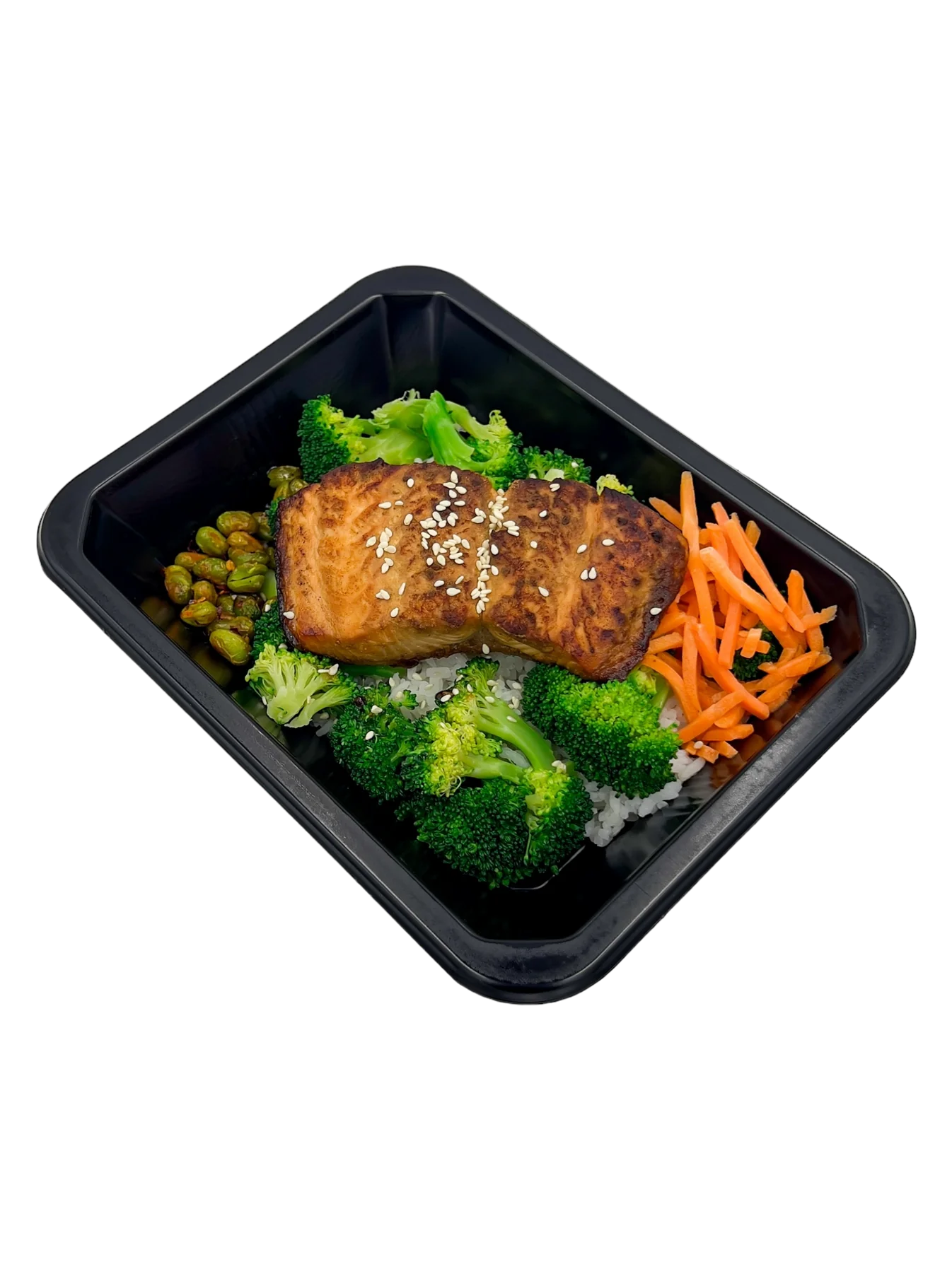 Ingredients: Thai Sesame Salmon, Jasmine Rice, Broccoli, Roasted Edamame, Shredded Carrots, Sesame Seeds, chili flake, sesame oil