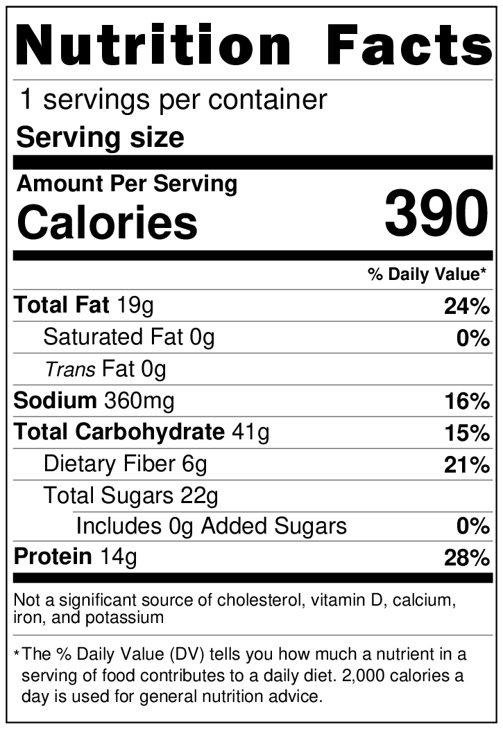 Per cookie: 383 cals - 19g Fat - 41g Carb (6g Fiber) - 14g Protein